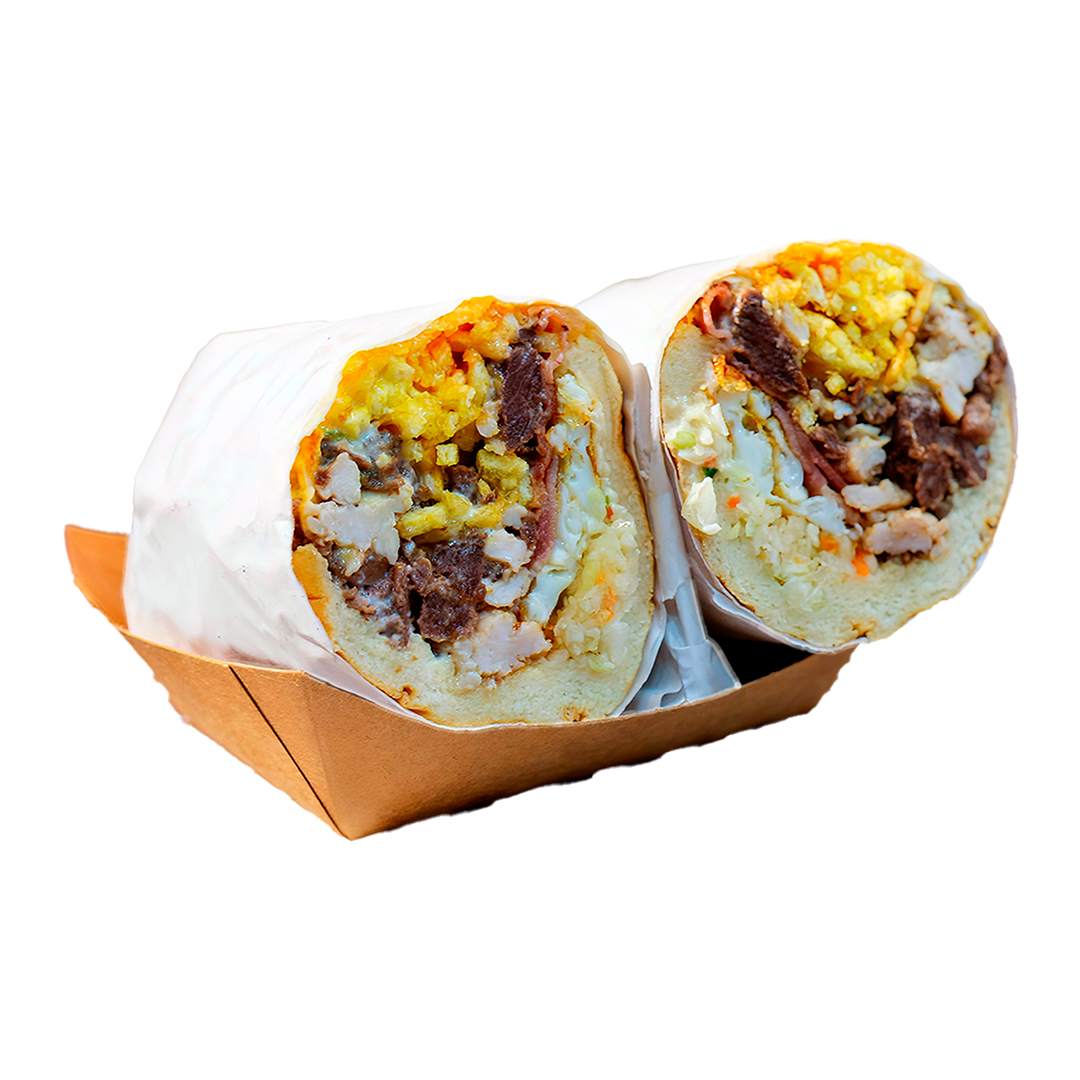 Pan jumbo, dos proteínas a elegir (Vacuno, pollo o cerdo), ensalada col, patatas paja, mayonesa, ketchup, mostaza.