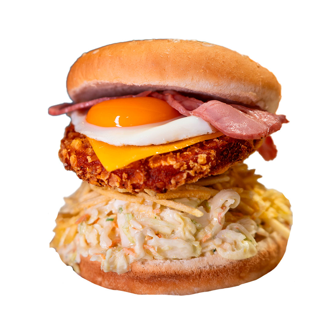 Pan, pollo crispy, queso cheddar, ensalada col, huevo, bacón, patatas paja, mayonesa, ketchup, mostaza.