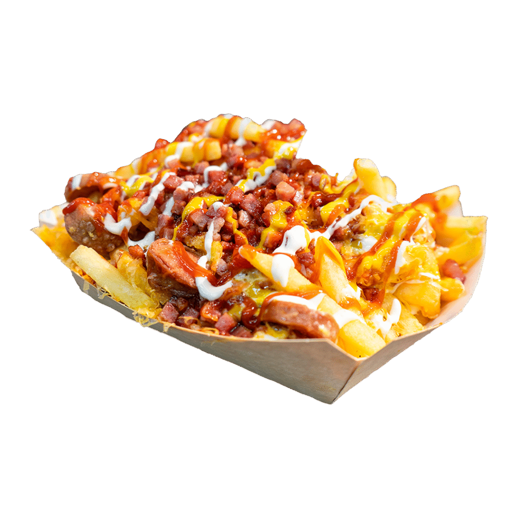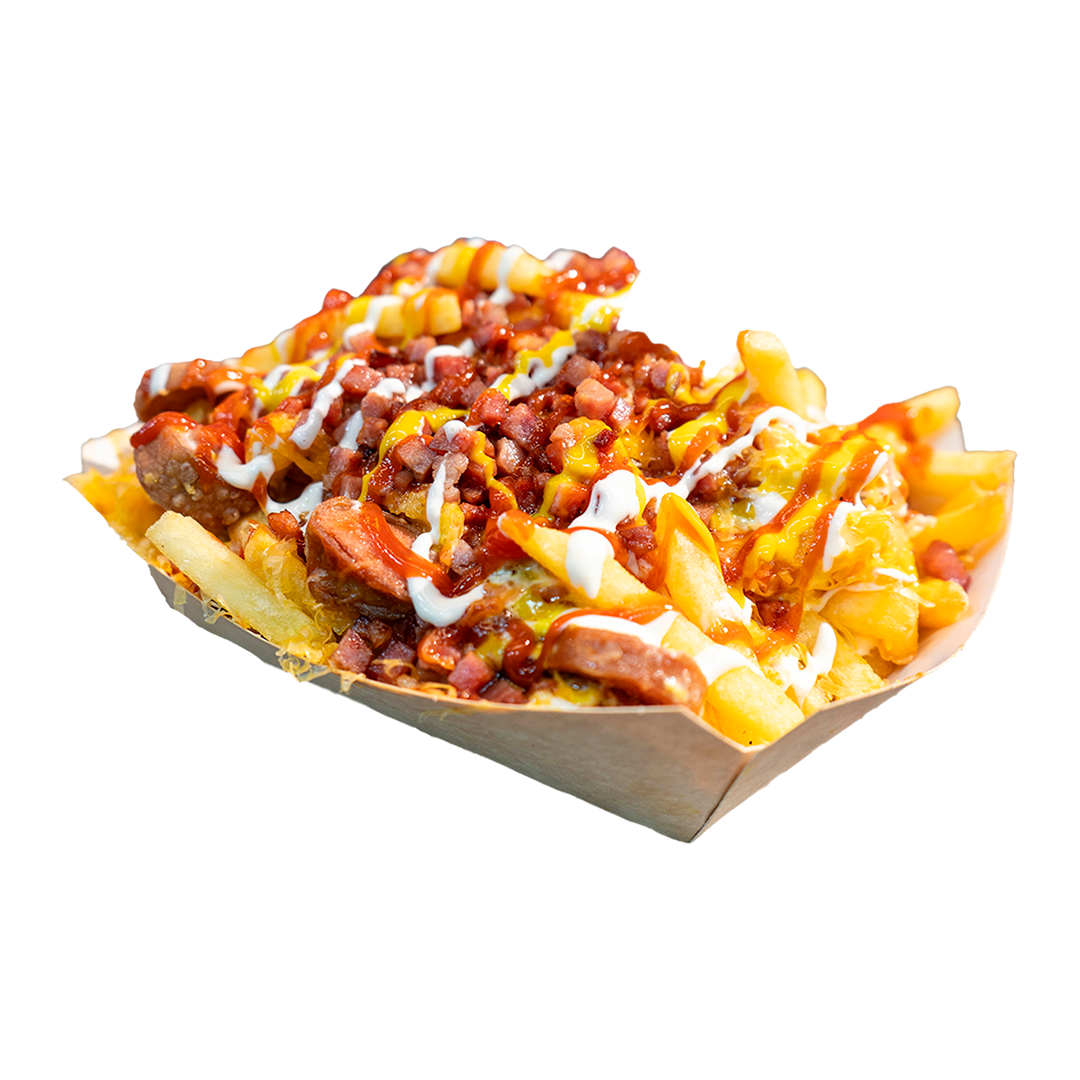 Patatas fritas, salchichas, bacón, queso cheddar, mayonesa, ketchup, mostaza.