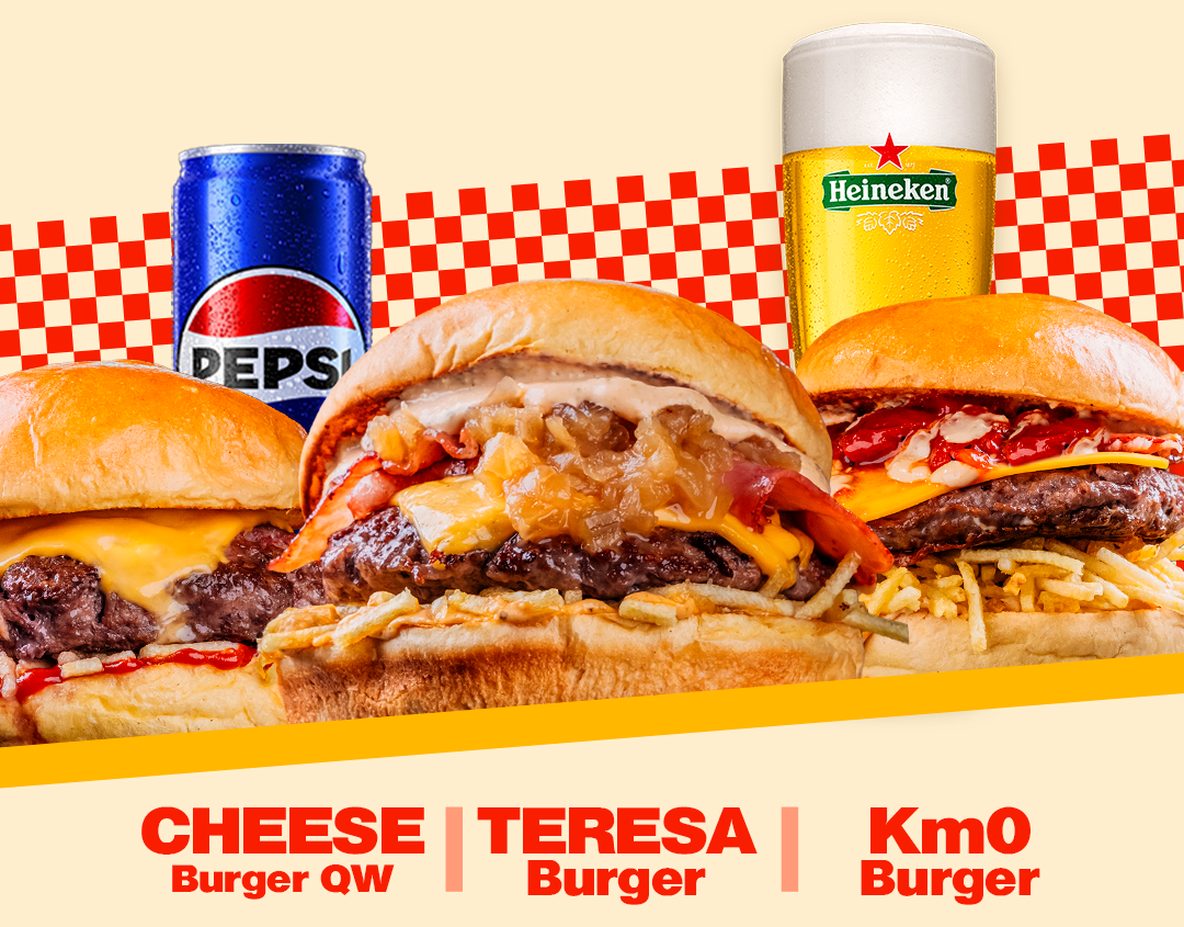 Todos los sábados y domingos, con la compra de una hamburguesa nueva (teresa burger. cheese burger qw, Km0), te REGALAMOS LA BEBIDA.